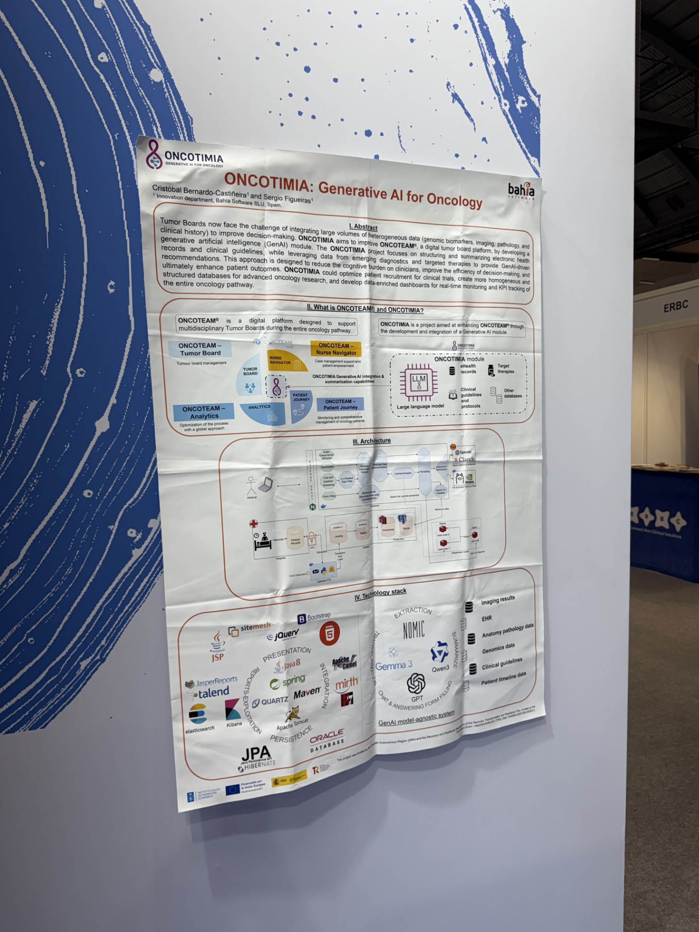 Durante BIOSPAIN, Bahía Software ha dado a conocer ONCOTIMIA mediante un póster científico y reuniones individuales (one-to-one), destacando un innovador módulo de IA generativa diseñado para apoyar a los comités moleculares de tumores. ONCOTIMIA emplea tecnologías de inteligencia artificial de última generación para resumir historias clínicas electrónicas y procesar datos oncológicos complejos, ofreciendo recomendaciones de tratamiento personalizadas. Además, garantiza una integración segura, escalable y explicable de la información generada por los comités de tumores en los flujos de trabajo clínicos.